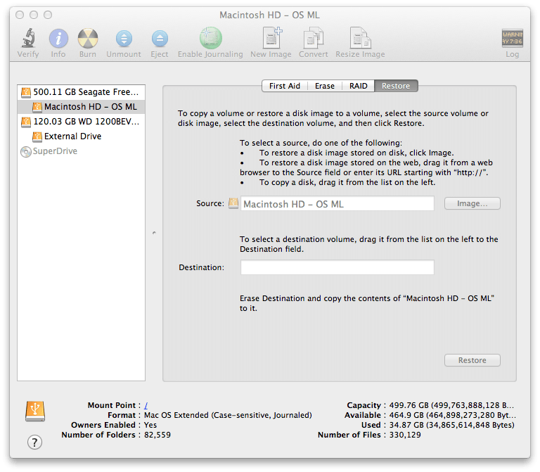 En utilisant la fonction de restauration de Clone Mac Hard Drive Disk Utility, vous pouvez restaurer toutes les données, même à partir d'un périphérique de stockage tel qu'un lecteur flash USB, un disque dur externe, une image disque, etc. Les lecteurs source et de destination doivent être monté à partir de votre appareil Mac et assurez-vous que ces disques ne sont pas utilisés pour éviter de modifier les données et assurer une restauration fluide et réussie de vos données. La création d'une image de sauvegarde de votre lecteur à l'aide de l'Utilitaire de disque de Mac vous aidera à protéger vos données contre toute perte. Il crée une copie exacte des données d'origine pour la sauvegarde.