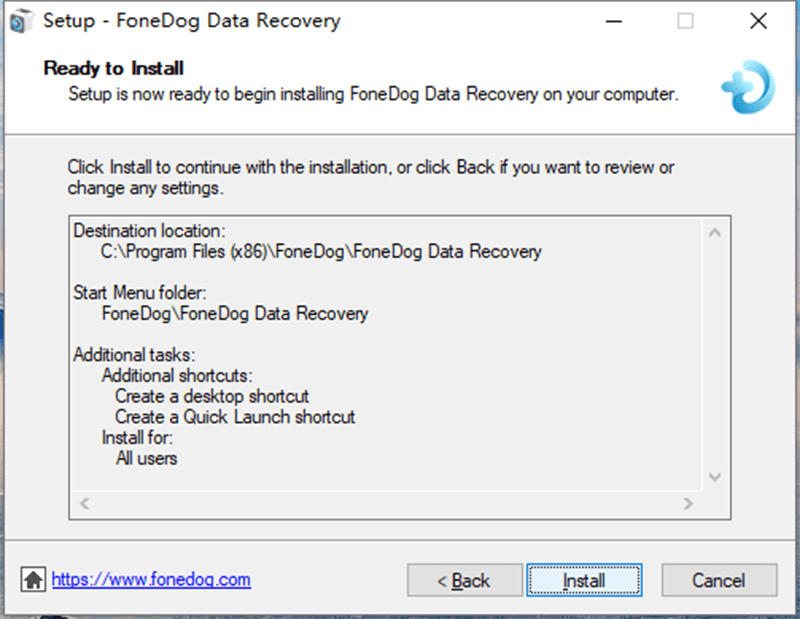 Appuyez sur la touche installer Ensuite, votre ordinateur utilisera l’installation de FoneDog Data Recovery.