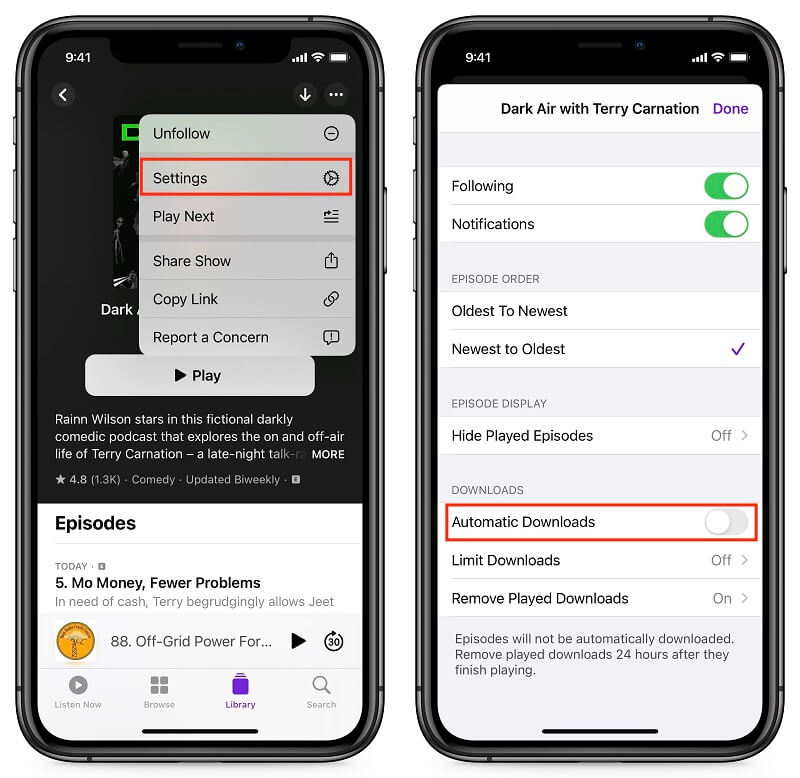 Si vous êtes abonné à une émission de podcast et que vous ne souhaitez plus recevoir les téléchargements automatiques, vous pouvez également la désactiver.