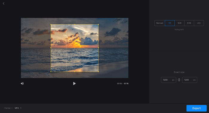 Si votre navigateur prend en charge le format vidéo téléchargé, vous pouvez utiliser l'outil de recadrage pour les graphiques pour choisir la section que vous souhaitez recadrer sur l'aperçu vidéo, ou saisir vous-même les dimensions appropriées et ses points de départ de section gauche ou supérieure. Vous pouvez également modifier le rapport d'aspect dans certains de nos préréglages, tels que carré, 4:3, 3:2, 16:9, et bien plus encore. Veuillez garder à l'esprit que l'aperçu vidéo peut parfois avoir une qualité inférieure, cependant, cela n'affectera pas sa sortie. Si vous souhaitez réduire la durée de la vidéo plutôt que sa taille, utilisez leur Coupeur vidéo.